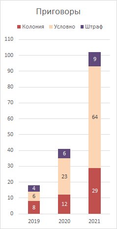 In total, during 2021, 32 believers were sentenced to real imprisonment, 68 believers were sentenced to suspended imprisonment and 10 to fines. In one case, no punishment was imposed in connection with the death of a believer. At least two believers, who now reside outside of Russia, are known to have been sentenced in absentia to prison.