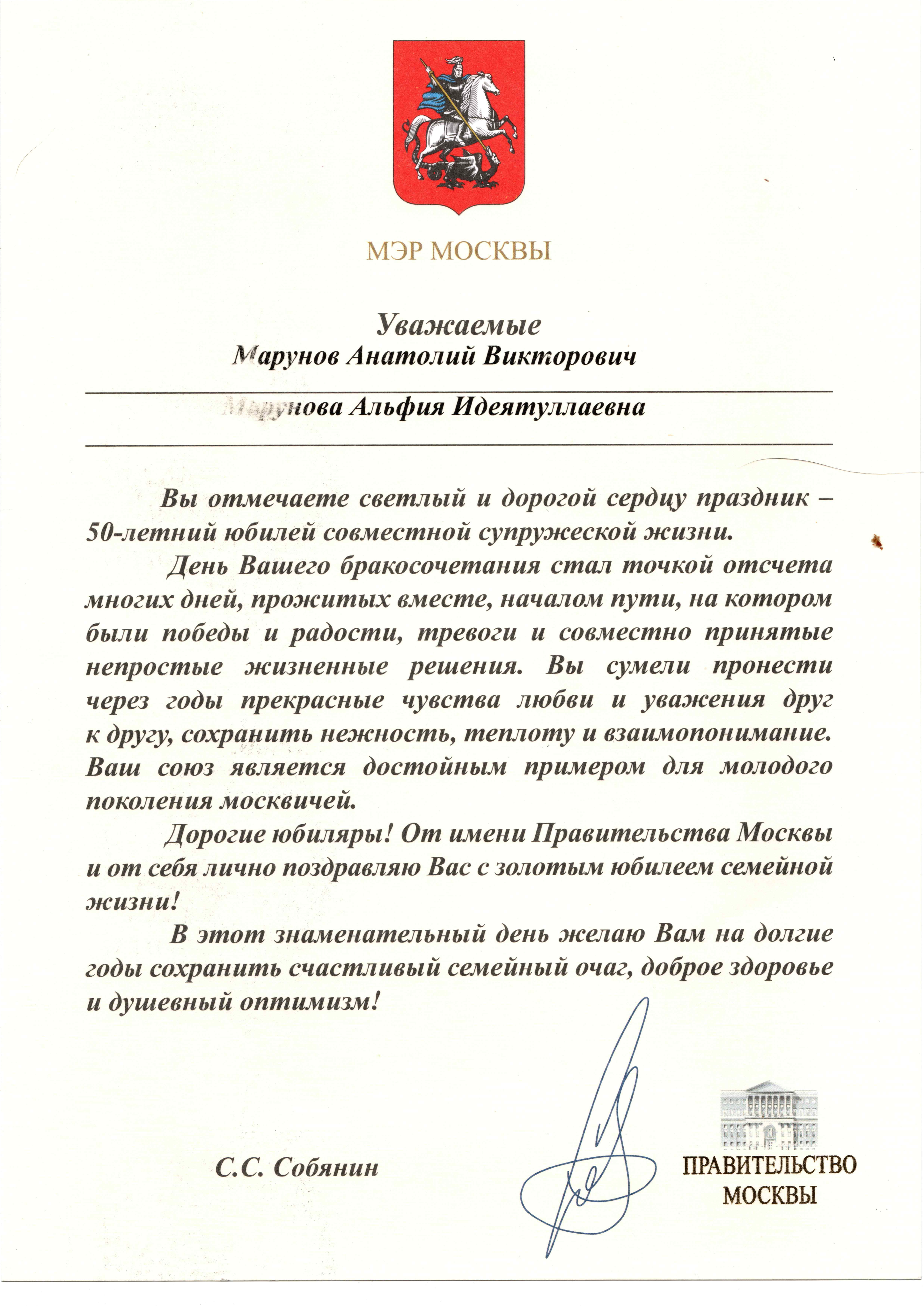 Congratulatory Certificate from the Mayor of Moscow to the Marunov family on their anniversary
