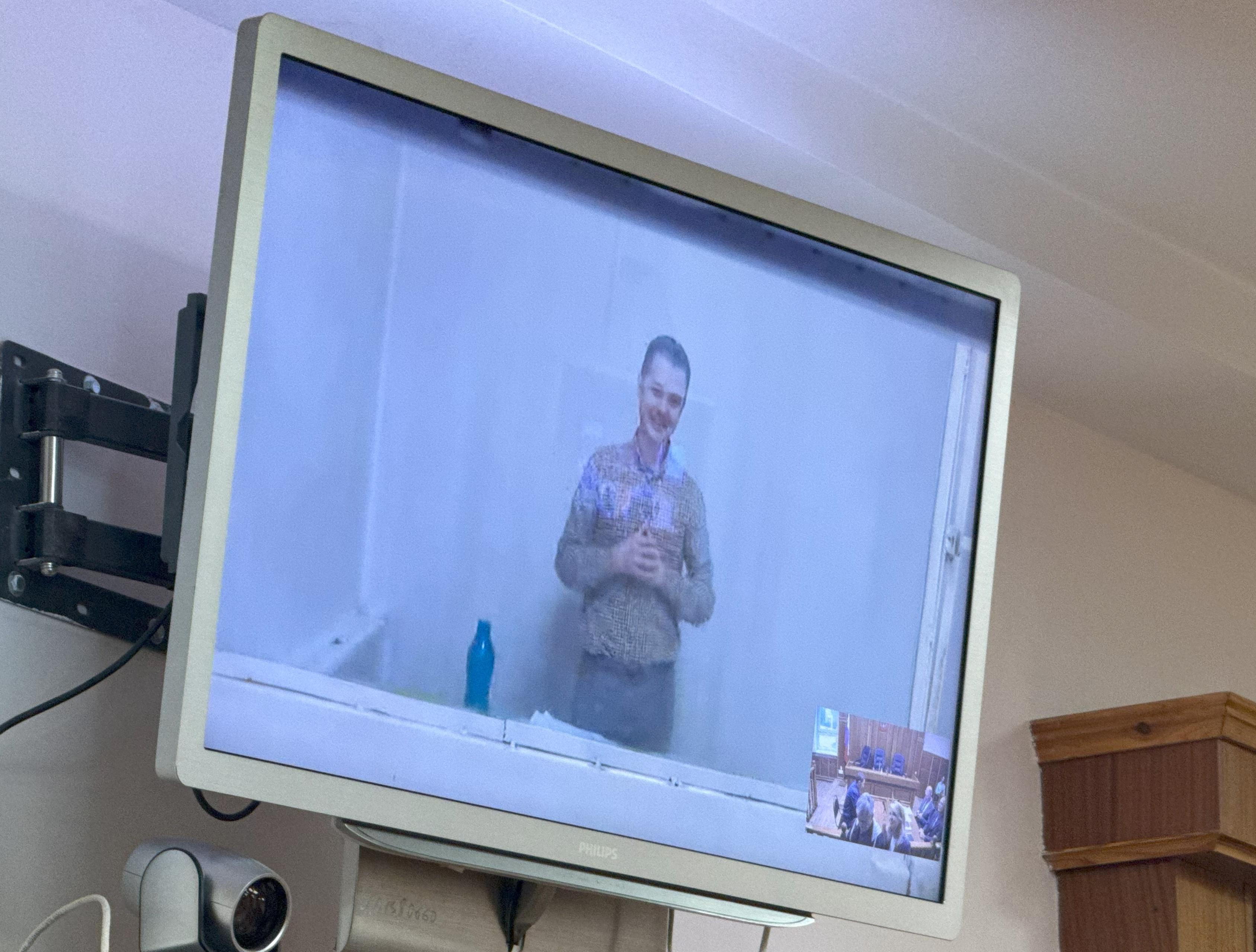 Interrogatorio del testigo de cargo Denis Polikarpov, que anteriormente había asistido a reuniones de adoración a los testigos de Jehová. En el otoño de 2018, comenzó a transmitir grabaciones de video y audio de reuniones con creyentes al FSB y a la policía. Cuando se le preguntó si Polikarpov puede dar ejemplos de declaraciones extremistas de Khamatshin, le resulta difícil responder.
