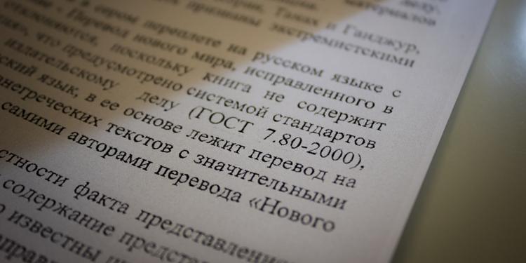 La proposición de que "la Traducción del Nuevo Mundo de las Santas Escrituras" no es la Biblia porque "el libro [...] De hecho, es una traducción al ruso, se basa en la traducción al inglés de textos hebreos y griegos antiguos con cambios significativos", carece de fuerza jurídica, contradice los hechos y el sentido común. Dado que la Biblia no fue escrita en idioma ruso, para la mayoría siempre es una traducción. Además, muchas ediciones de la Biblia, tanto en idiomas grandes como pequeños, fueron el resultado de una traducción en dos etapas, es decir, una traducción hecha a partir de una traducción. Por ejemplo, la traducción de la parte del Antiguo Testamento de la Biblia eslava de la Iglesia, que todavía se usa oficialmente en el culto ortodoxo, se hizo a partir de una traducción conocida como la Septuaginta. La traducción sinodal de la Biblia, aprobada oficialmente en la ortodoxia para la lectura en el hogar, también sigue esta tradición en muchos lugares.