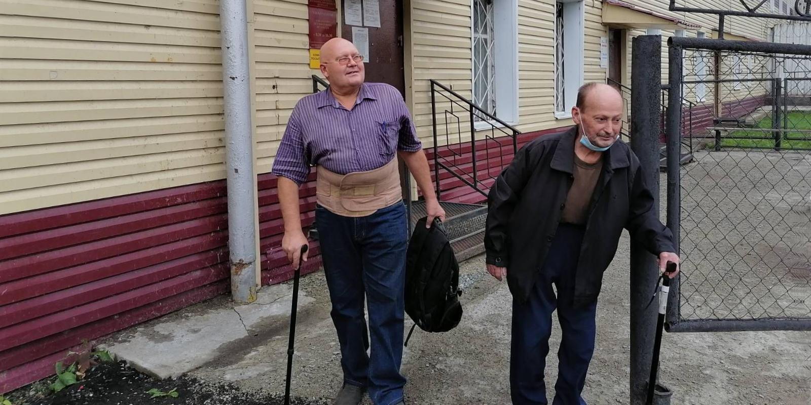 写真:障害者グループIIの信者アナトリー・イサコフさんとアレクサンドル・ルービンさんが、公判前拘置所を出る。クルガン市、2021年8月