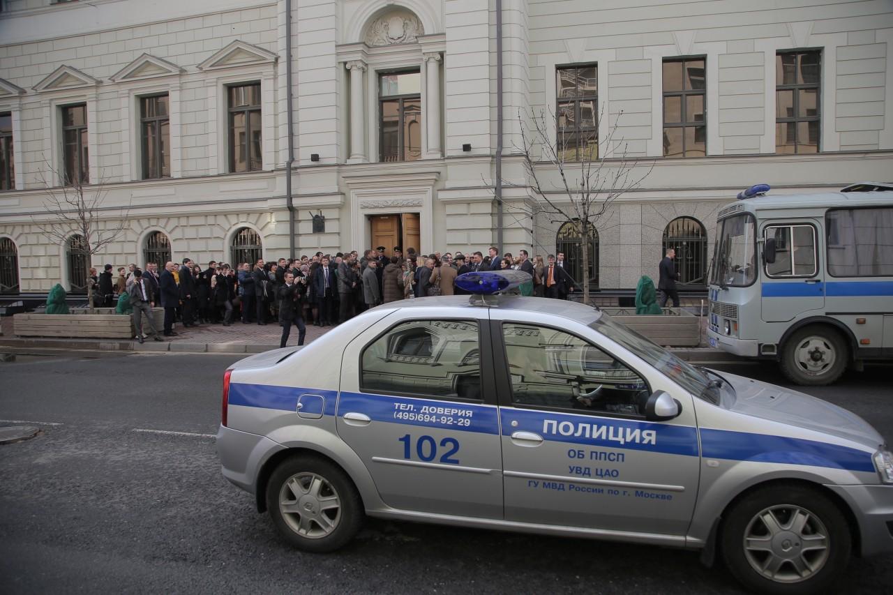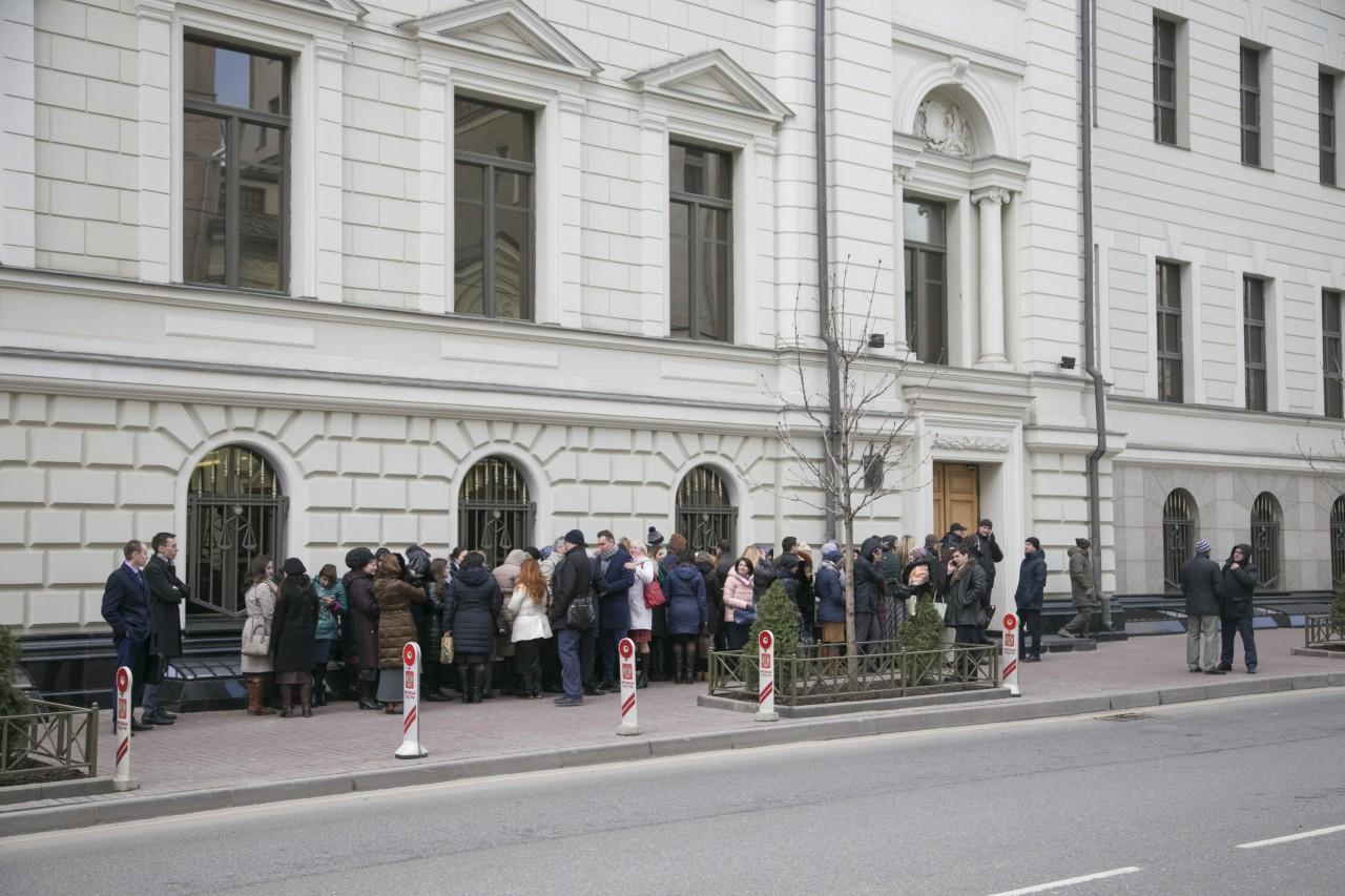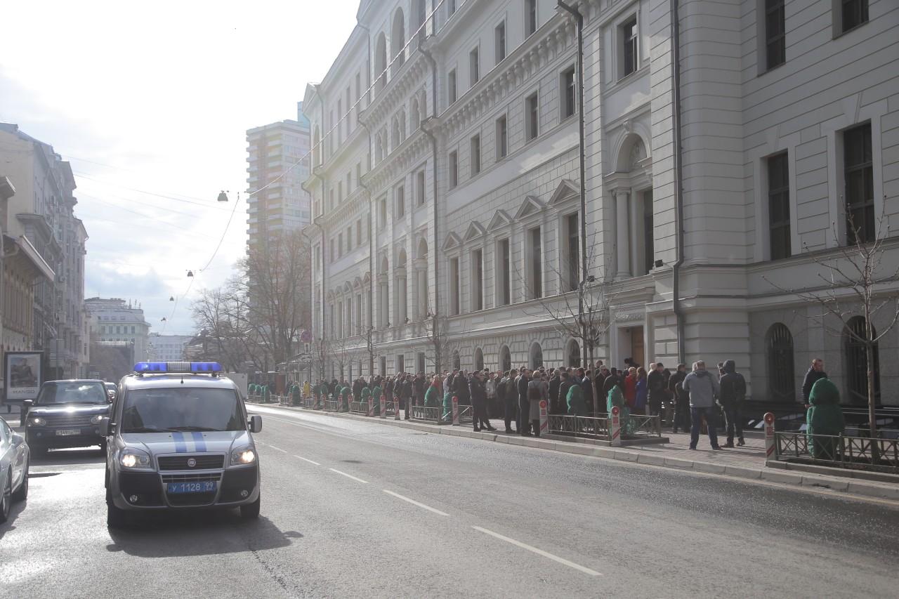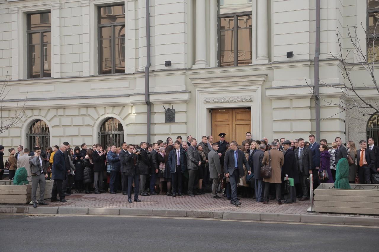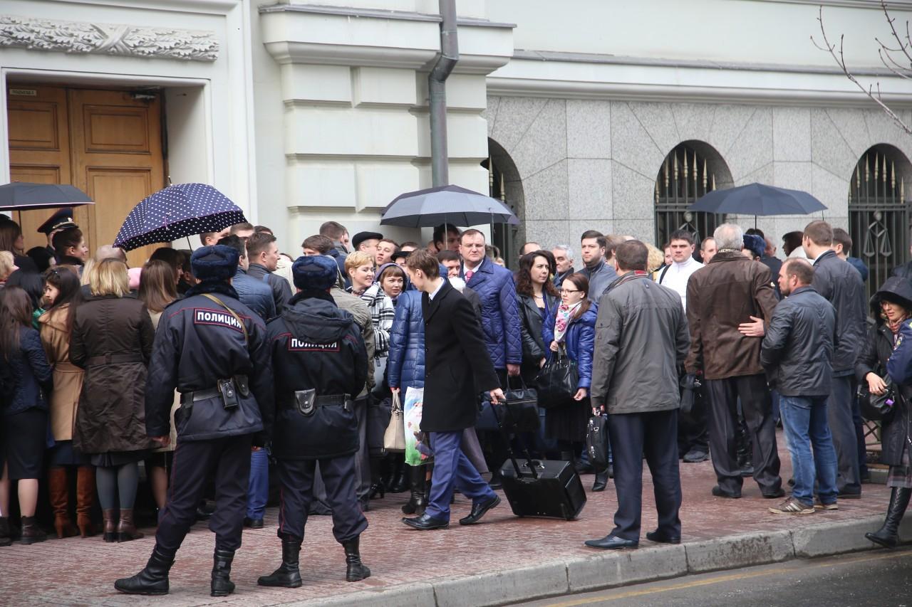 | 9:00 | Перед зданием Верховного суда как никогда многолюдно. Очередь начала выстраиваться еще с ночи. Многие специально приехали из разных городов России. Поскольку погода в Москве холодная, большинство одеты по-зимнему. Время от времени кто-то приносил кофе и пирожки для стоящих в очереди. Сотрудники полиции работают профессионально и слаженно, обеспечивая безопасность для слушателей процесса. |